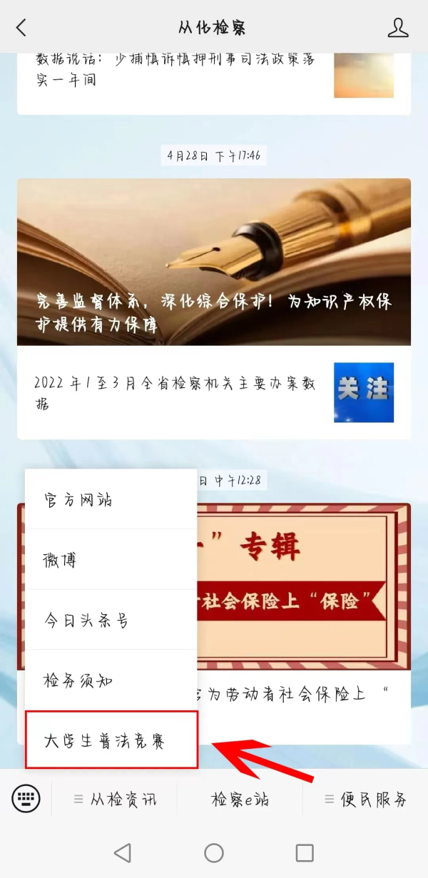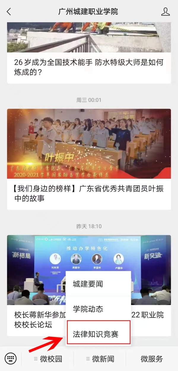 第二步:点击“从化检察”公众号下方菜单栏“从检资讯”→“大学生普法竞赛”,学习相关法律法规和案例;第三步:点击“广州城建职业学院”公众号下方菜单栏“微新闻”→“法律知识竞赛”,进行相关法律知识的学习和查看相关竞赛活动信息。