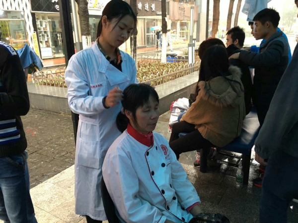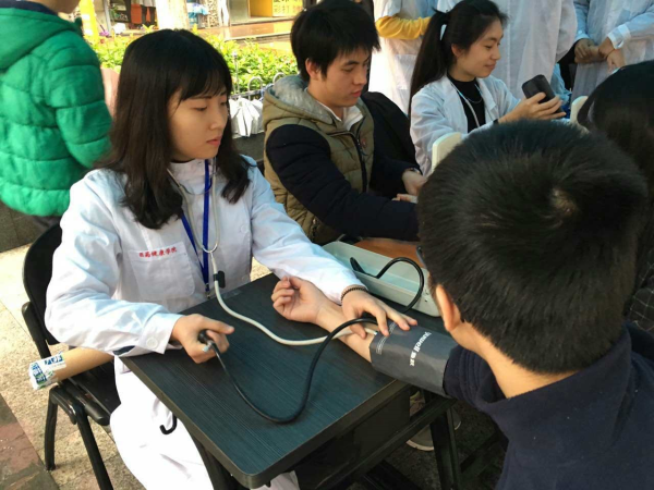 为更好践行雷锋精神,将医药健康学院专业化志愿服务的优良传统传承下去,医药健康学院特于3月17日下午在广州校区后街开展雷锋月义诊活动。当天下午,天空飘起毛毛细雨,但丝毫不能阻挡志愿者的热情,到场接受服务师生也十分踊跃参与体验,连保洁阿姨都被热情的服务和专业的技能吸引过来,接收健康服务。