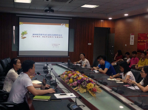 会议最后,林少镇老师向学生作了诚信还款动员讲话,强调了征信意识的重要性,希望同学们严格遵守国家助学贷款还款确认的有关规定,在当前日趋完善的市场经济体系下,要时刻注意维护自身的诚信行为,做一个诚实守信的人,维护自己和母校的荣誉。并表达了对本届贷款毕业生能够在毕业后一路顺风,前程似锦的深切期望。